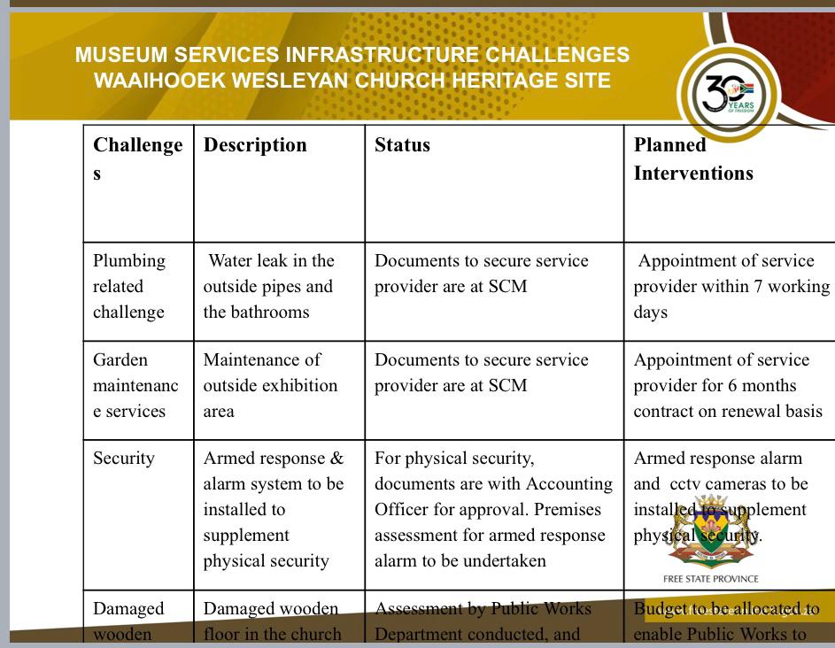 During an oversight to this site in July 2025, the Free State Legislature was informed by the Department of Sports, Arts, Culture and Recreation that the buildings experienced serious maintenance issues such as water leaks, damaged wooden floors, overall poor maintenance and lack of security. The museum and church are empty shells with only some kitchen equipment in the kitchen of the museum. The members of the legislature were informed that the surrounding areas are hotspots of criminal activities such as drug dealing and police regularly visit the area to collect bribes. The roads leading to the church are dangerously potholed, sidewalks are littered with refuse and dirt and surrounding buildings are neglected and vandalised.